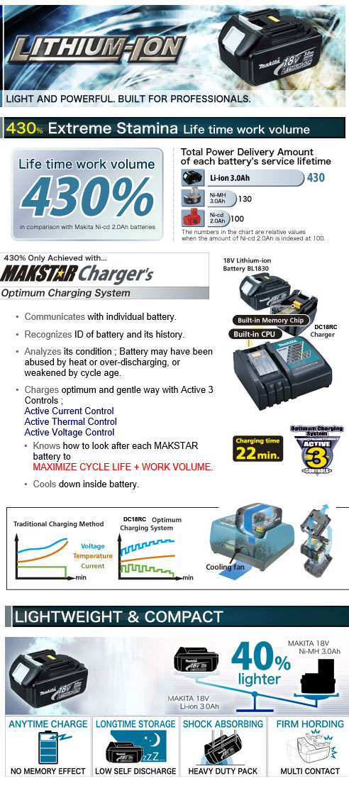 The ultimate power to weight ratio, 18 Volt Lithium-ion. Makita have the best and most comprehensive range of professional Lithium-ion tools available on the market, so what ever your trade, you will be confident that you have made the best choice. Lithium-ion, the battery has evolved.