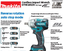 - Reverse rotation auto stop mode stops the impact and rotation in 0.2 seconds after the bolt/nut gets loosened enough.