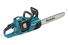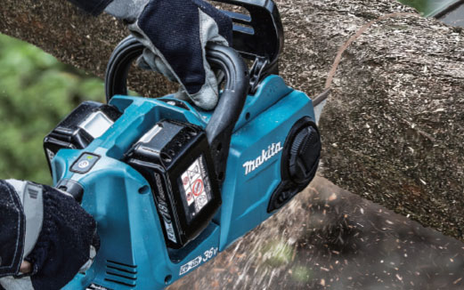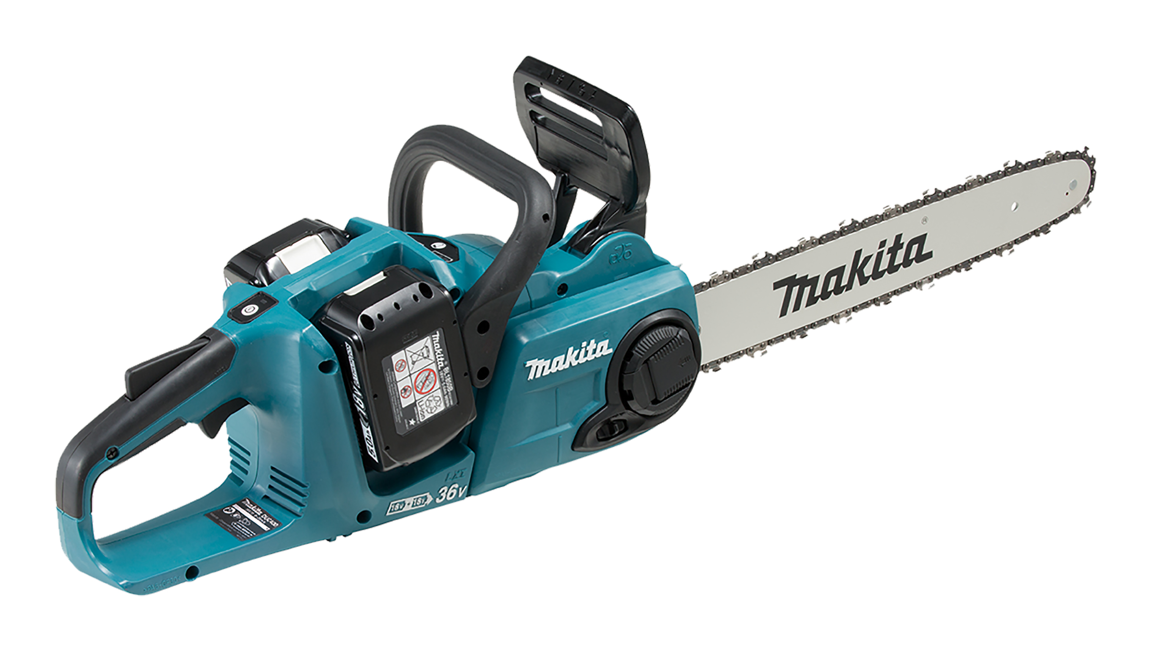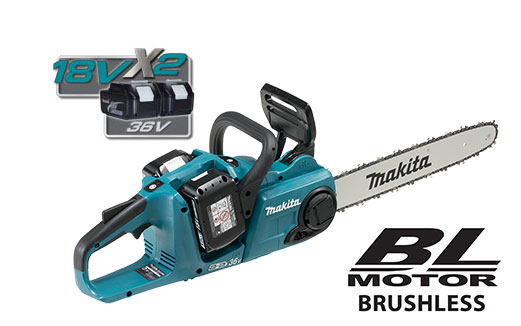 Cordless chain saws powered by two 18V Li-ion batteries in series.