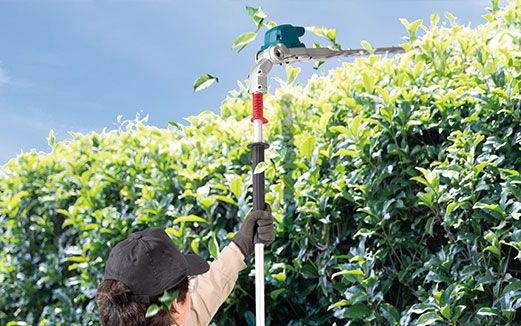 Angle adjustable hedge trimmer head; 45° tilt-up to 70° tilt-down from the horizontal position; Can be folded in the 180° position for easy transport and storage; Built-in clutch works to stop the blade motion even if the throttle lever is touched during folding operation; 6 angle settings (45°, 22.5°, 0°, -22.5°, -45°, -70°); The angle of hedge trimmer head can be changed simply by operating a lever