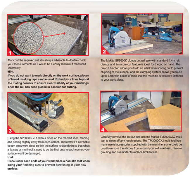 The Makita plunge cut circular saw - versatile plunge saw ideal for kitchen worktops, door fitting and timber trimming. Below is a project being the preparation for the installation of a hob or sink, in a melamine or wooden countertop.
