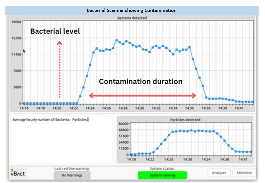 Current procedures for measuring bacteria counts are mostly manual, complex and only produce results 1to3 days after the event. This new imaging system produces accurate and reliable total bacteria count results automatically and without sampling gaps, every minute!