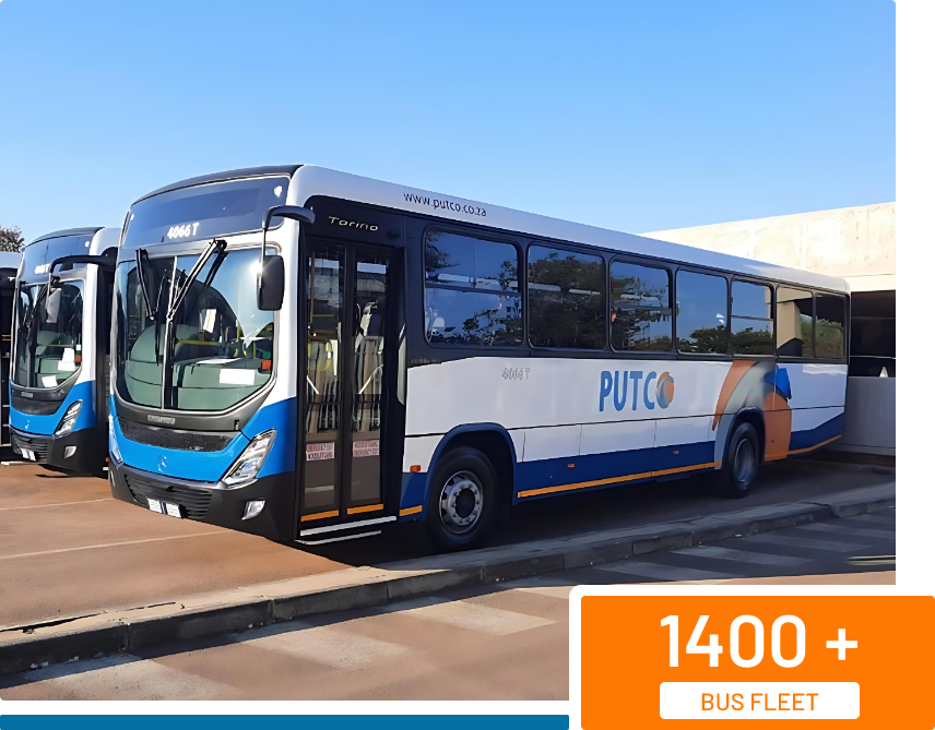 Putco has a fleet of 1 400 buses and transports more than 210 000 passengers daily. The company operates in Gauteng, Mpumalanga and Limpopo. The Putco fleet travels approximately 82 million kilometres per year or 290 000 kilometres per day. We employ more than 3600 employees with an approximate 18,000 persons that depend on the Company for their livelihood.and just under 1 600 are drivers, 69 of which are female drivers.Our operating hours are from 02h30 to 22h00.